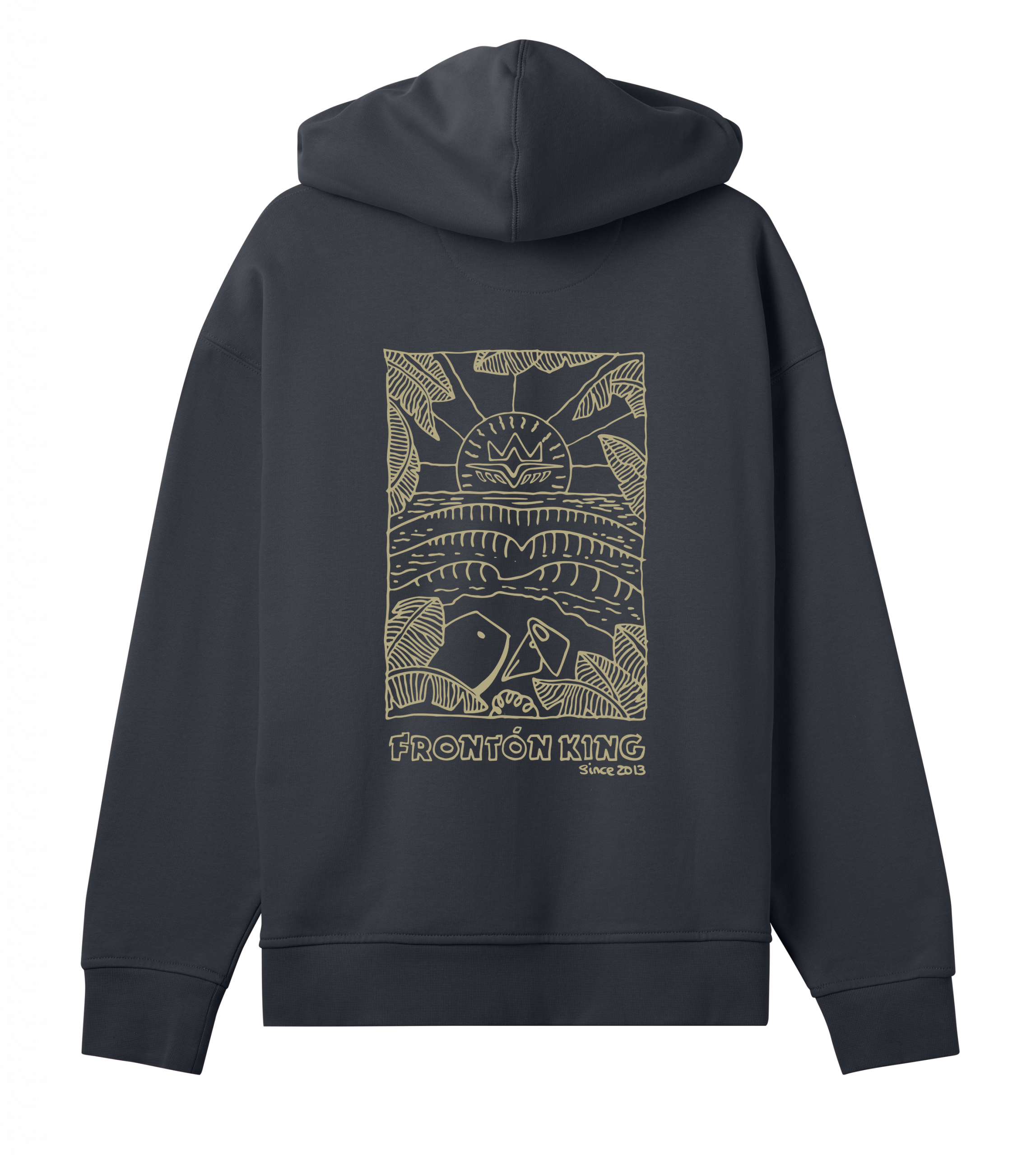 El corte boxy y los hombros caídos aportan una silueta moderna y relajada, mientras las costuras reforzadas y los ribetes gruesos garantizan durabilidad y forma. El logo Frontón King bordado en el pecho simboliza la conexión con el mar, la libertad y la autenticidad que define a la comunidad del bodyboard.